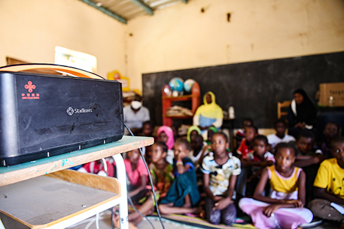 “万村通”项目是2015年中非合作论坛约翰内斯堡峰会提出的中非人文领域合作举措之一,旨在为非洲30多个国家的1万个村落接入卫星数字电视信号,并向20万个非洲家庭捐赠机顶盒。来自中国的企业四达时代集团作为实施方承建该项目。图为11月22日,在塞内加尔达喀尔近郊的辛迪亚小学,同学们课间坐在教室的地毯上观看投影播放的动画片。
