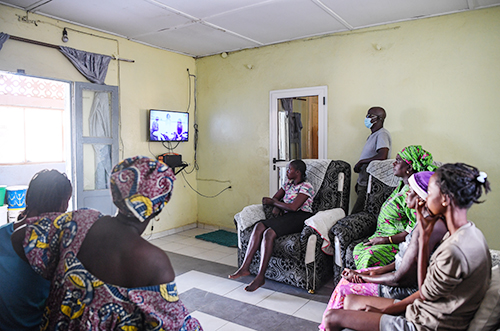 11月22日,在塞内加尔达喀尔近郊的辛迪亚村,村民使用“万村通”项目的电视机顶盒观看电视节目。