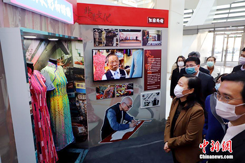 11月25日,由香港特别行政区政府驻北京办事处及驻天津联络处主办的“同根同源·传承传情”香港文化行巡回展览在天津开幕。展览中的香港非遗项目“粤剧”及“中式长衫和裙褂”,与天津非遗项目“京剧”、“评剧”及“老美华津派旗袍”有神似的地方,体现了“同根同源·传承传情”的精神。图为嘉宾参观展览。