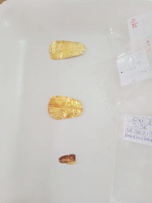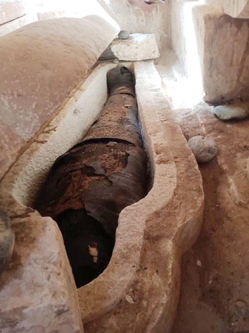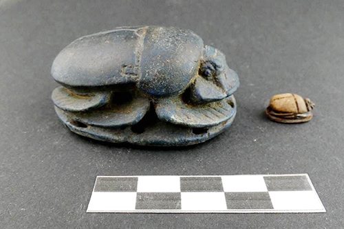 埃及旅游和文物部12月5日发表声明说,来自西班牙的考古团队在埃及明亚省拜赫奈萨考古区发现两座距今超过2500年的墓葬,并出土两具口含“金舌”的人类遗骸。图为埃及明亚省古墓葬中出土的圣甲虫。