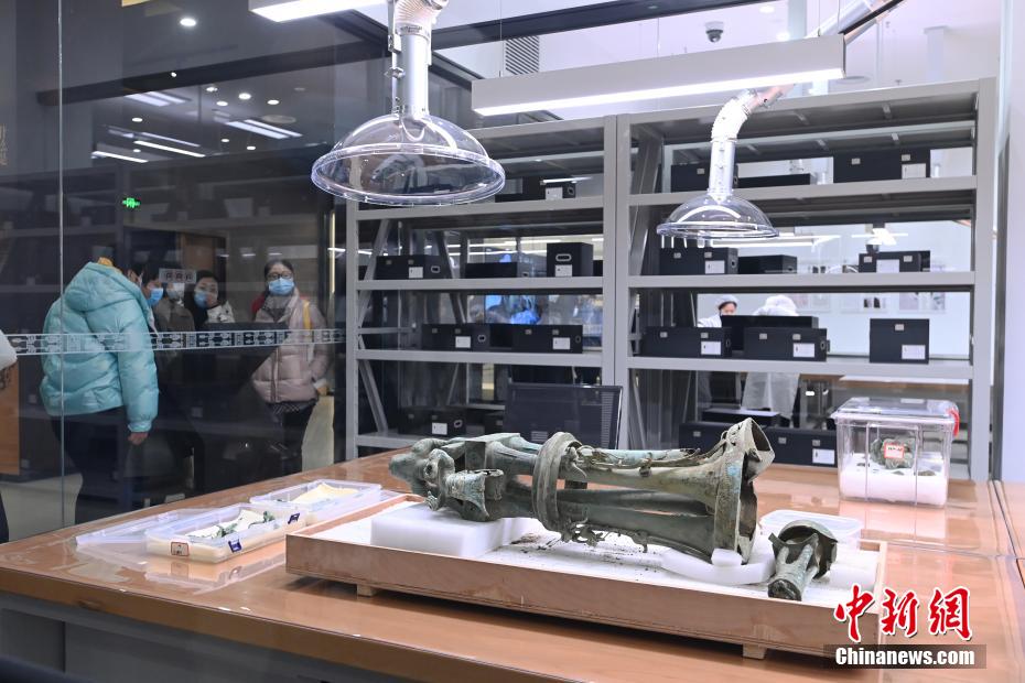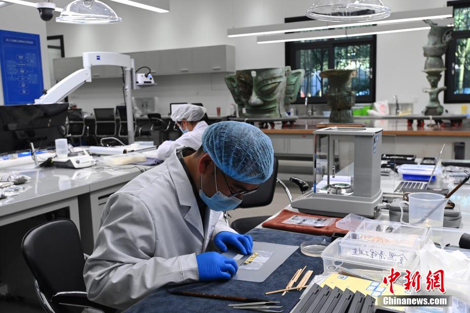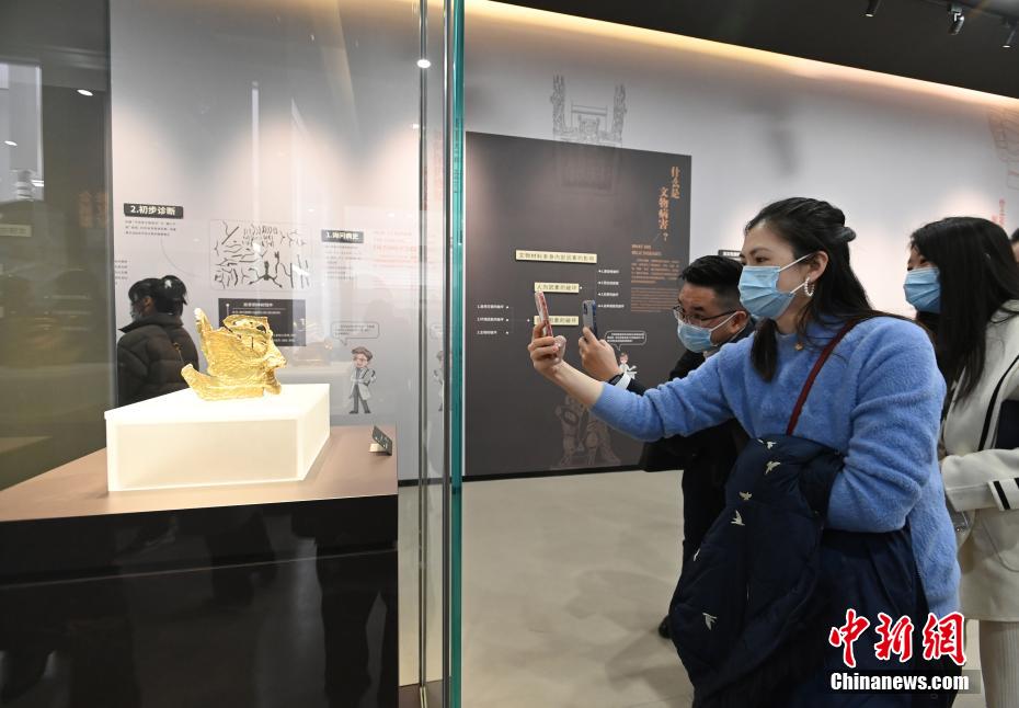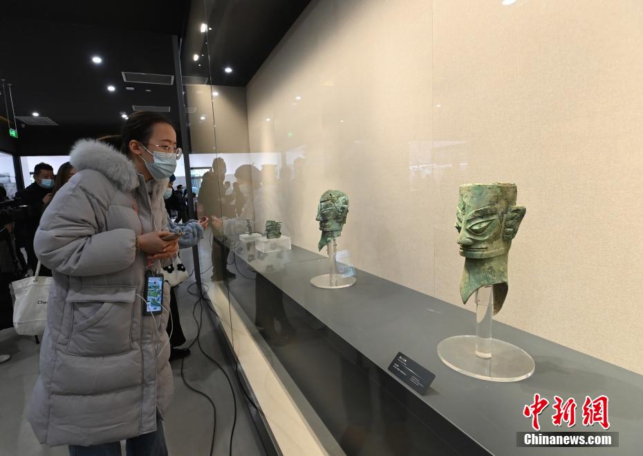 12月18日,三星堆开放式文物保护与修复馆正式开馆。该馆面积约1000平方米,融文物修复、文物展示、参观体验、科普教育等功能于一体,运用最新的文物保护修复理念、现代化文保设施设备以及一流的保护修复技术,打造的三星堆遗址出土文物保护修复展示一体化工作平台。图为展出修复的金面罩。