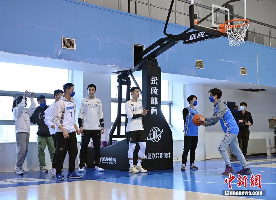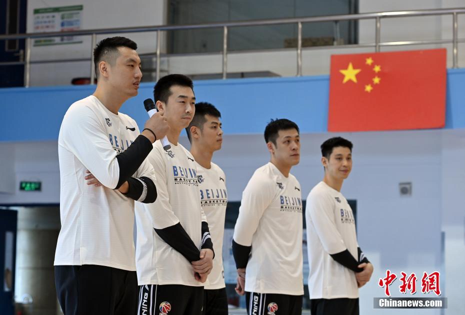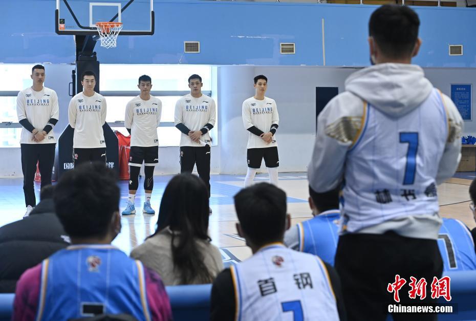 首钢男篮队长翟晓川、王骁辉、方硕、周仪翔、林书豪(左起)与青年代表们见面。