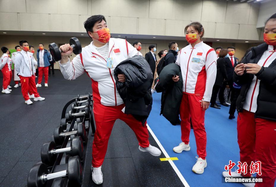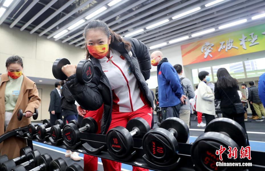 12月20日,内地奥运健儿代表团在澳门运动员培训及集训中心参访,东京奥运会女子铅球冠军巩立姣体验训练设备。
