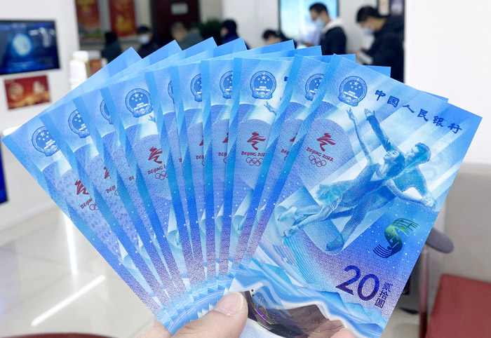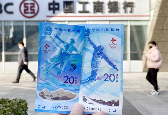12月21日,中国人民银行发行第24届冬季奥林匹克运动会纪念钞一套,每张面额均为20元人民币,发行量是2亿套。该套纪念钞包括冰上运动项目和雪上运动项目各1张,系中国首次成套发行的纪念钞对钞。冰上运动项目纪念钞为塑料纪念钞,雪上运动项目纪念钞为纸钞。图为北京市民在北京中国工商银行网点门前展示刚兑换到的北京2022冬奥会纪念钞。南美侨报网特约记者卞程宣摄