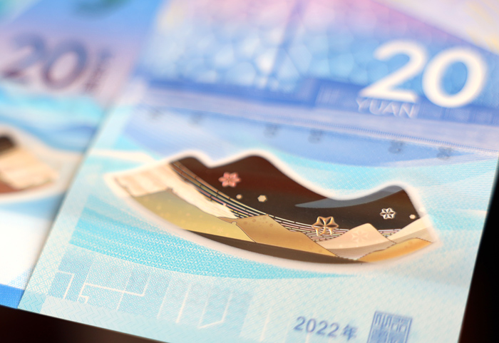 12月21日拍摄的塑料材质的冰上运动项目纪念钞局部。改变观察角度,正反面均可见动态立体面额数字、多彩动感核心图形。南美侨报网特约记者卞程宣摄