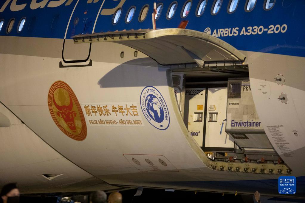 2月25日在阿根廷布宜诺斯艾利斯拍摄的运载中国新冠疫苗的包机。为表达对中国的感谢,阿根廷政府特意在包机上设计了中国传统剪纸生肖牛的图案,并用中文和西班牙文在机身印上了“新年快乐 牛年大吉”字样。
