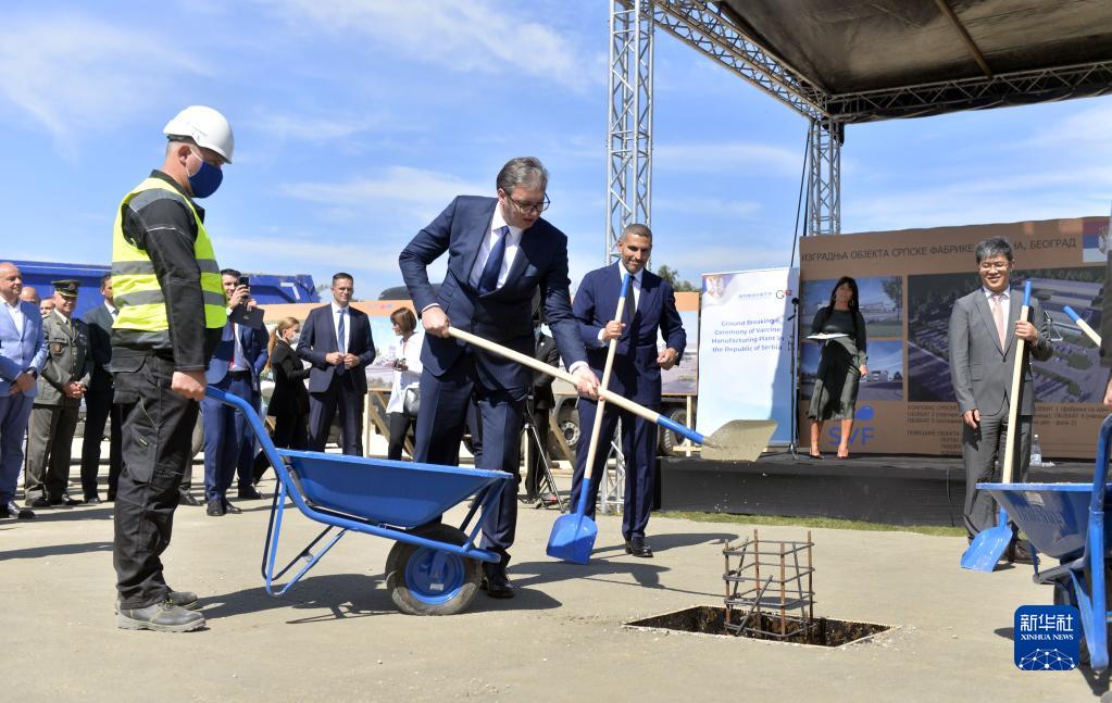 9月9日,在塞尔维亚贝尔格莱德,塞尔维亚总统武契奇(中)为欧洲地区首家中国疫苗工厂奠基。