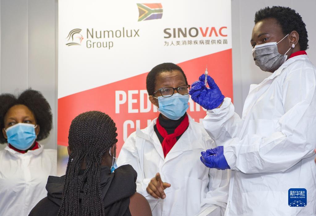 9月10日,南非医务人员在比勒陀利亚为参加临床试验的青少年注射中国科兴公司生产的新冠疫苗。