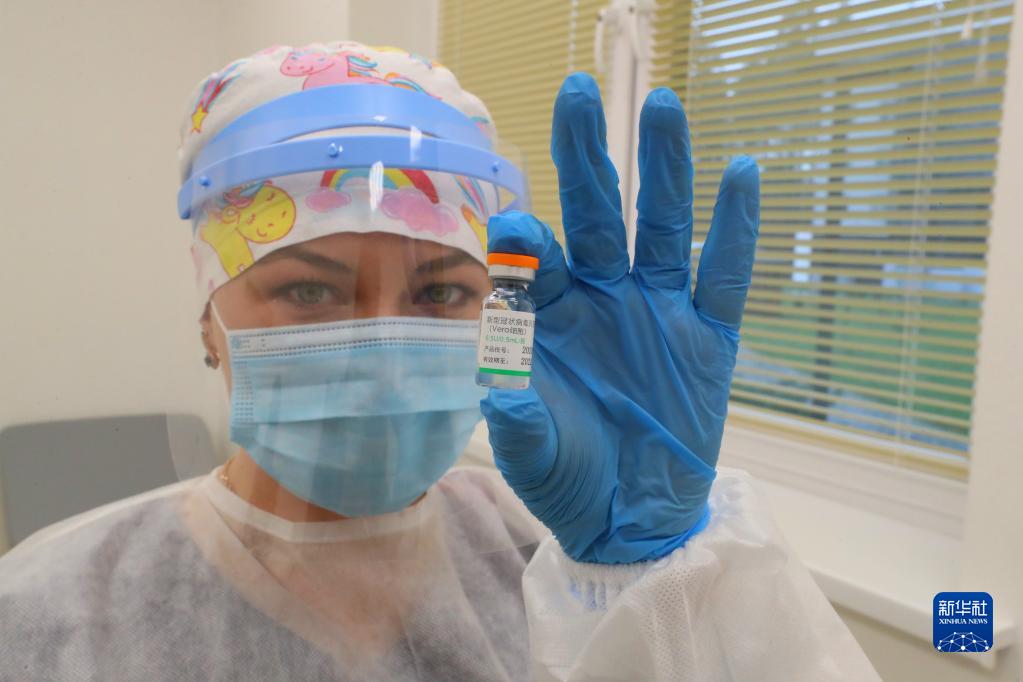4月16日,在白俄罗斯首都明斯克郊区的中白工业园,医务人员展示中国国药集团生产的新冠疫苗。