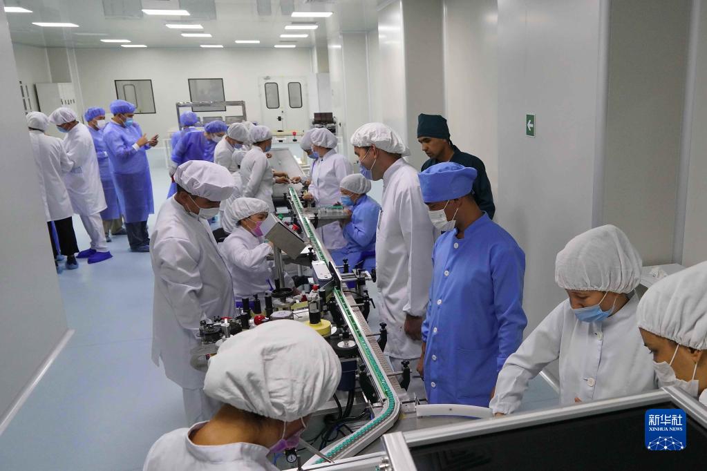 9月5日,在乌兹别克斯坦制药企业祖拉贝克实验室有限公司,工作人员在由中国科学院微生物研究所和安徽智飞龙科马生物制药有限公司共同研发的新冠重组蛋白疫苗生产线上工作。