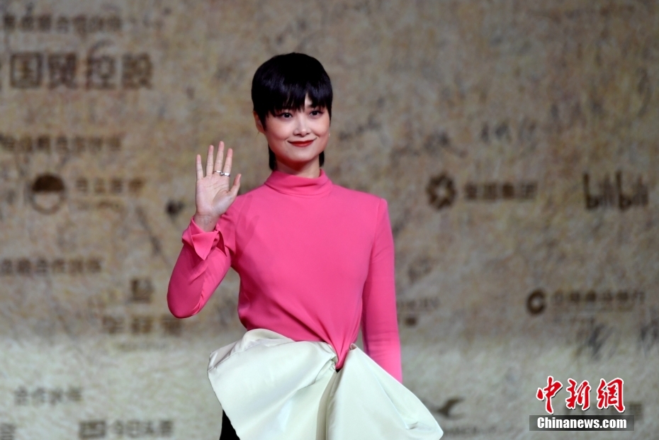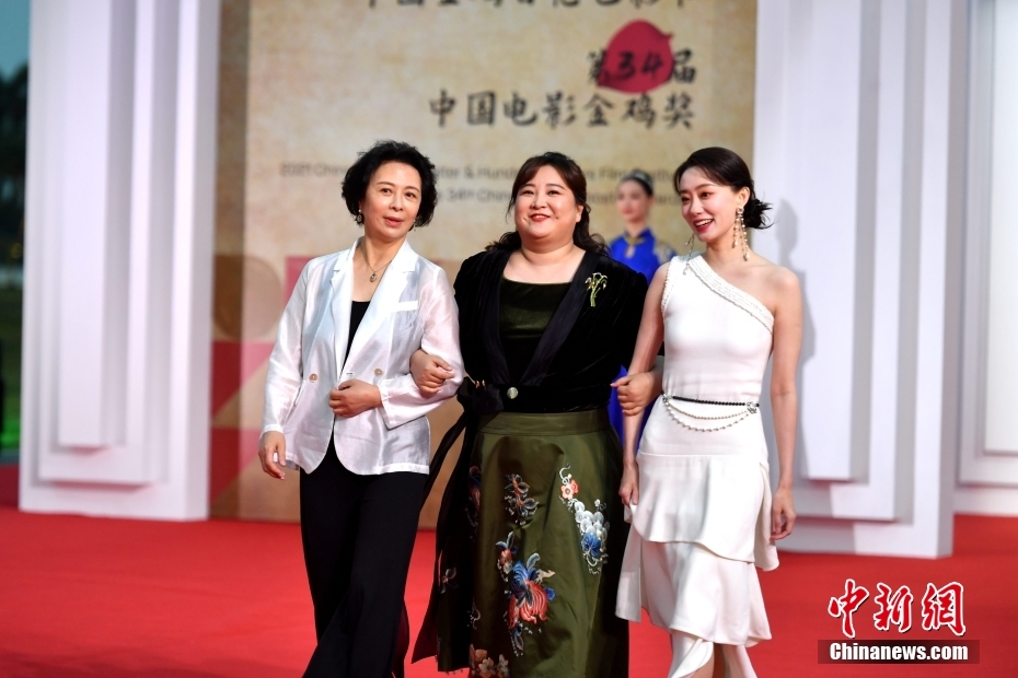 张小斐(右)、贾玲(中)等亮相红毯仪式。中新社