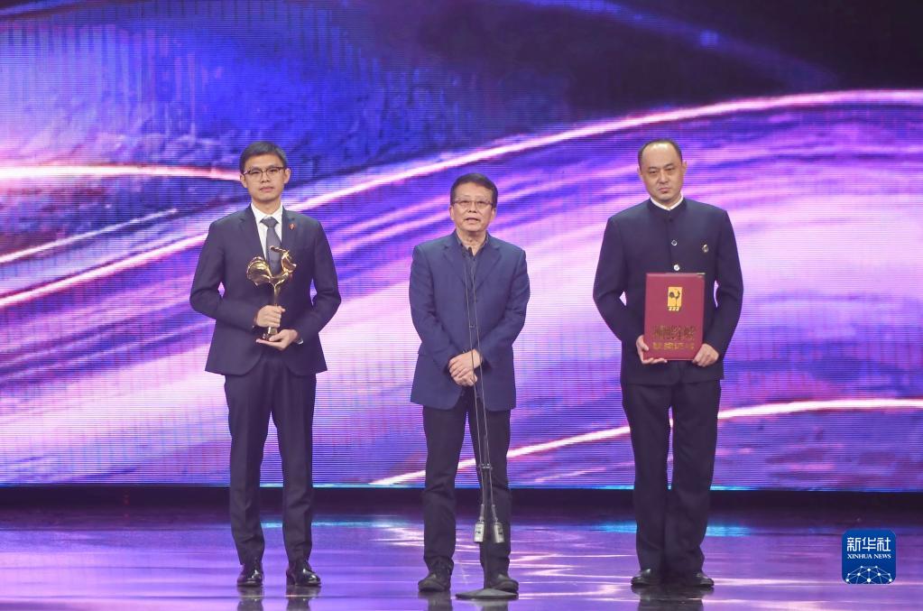 12月30日,获得最佳编剧奖的《1921》主创人员在台上领奖。新华网