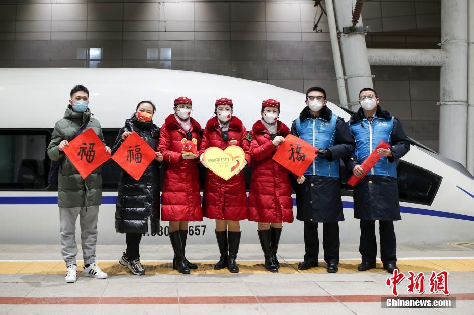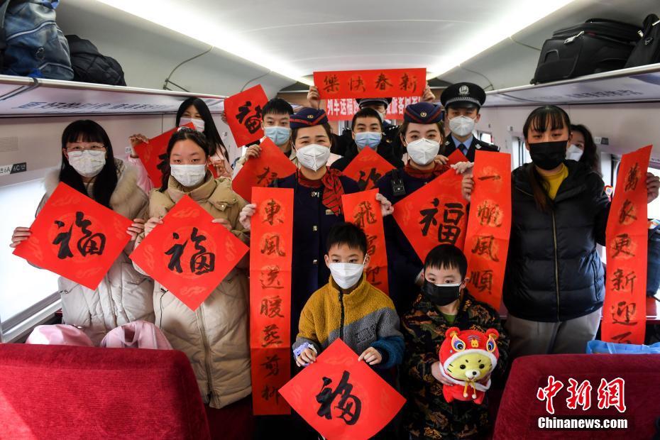 1月17日,中国铁路武汉局集团公司襄阳客运段联合襄阳铁路公安处在G6818次列车上开展“列车送福迎春运,温暖旅客回家路”活动。连日来,湖北铁路部门组织书画家走进高铁车厢现场挥毫泼墨,书写吉祥春联、福字,免费赠送给旅客。与此同时,列车乘务员还同乘警一起向旅客进行防电信诈骗、疫情防控、安全乘车注意事项等系列安全知识宣传。图为乘务员与与旅客合影留念。