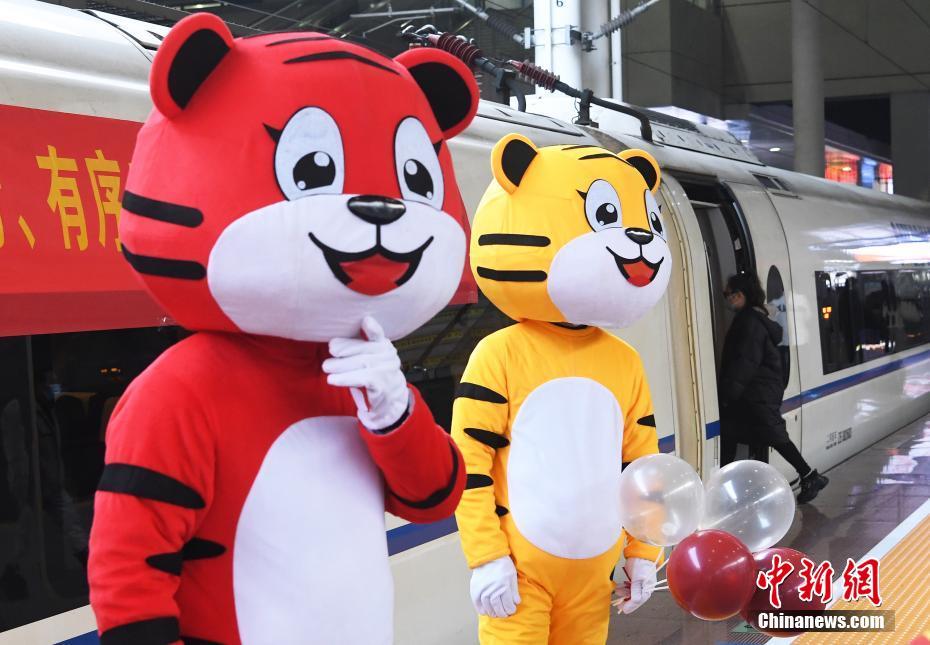 1月17日,重庆客运段列车乘务员身着老虎人偶服迎接旅客。
