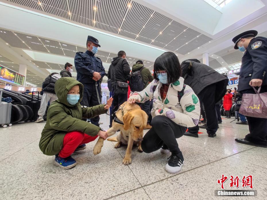 1月17日春运首日,在广西柳州火车站内,柳州铁路公安处民警带着警犬在快递包裹中搜索二手手机和pos机等“电诈”工具,吸引众多旅客的目光。期间,旅客可以和警犬亲密接触,温顺的警犬吸引众多旅客前来“撸狗”。当天,民警通过开展乘车禁限带物品讲解、防电信诈骗等安全宣传,提高旅客群众的防范意识和安全意识,营造温馨和谐的春运氛围,保障旅客平安出行。图为旅客在活动中抚摸警犬。