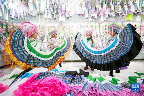 1月24日,苗族青年在尖山村一家民族服饰厂试穿苗族百褶裙。