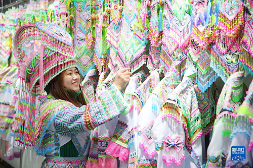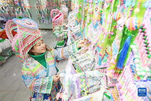 春节临近,贵州省毕节市竹园乡尖山村苗族群众来到家门口的民族服饰厂,选购自己喜爱的民族特色首饰、服饰,喜迎新年。
