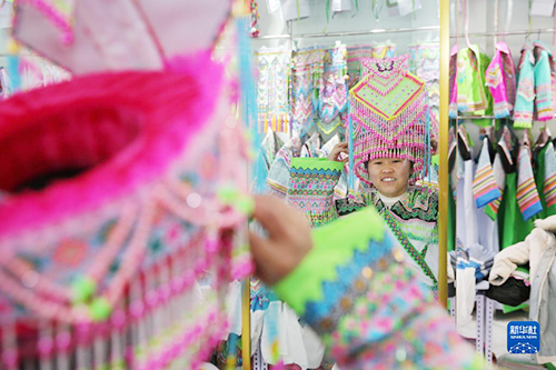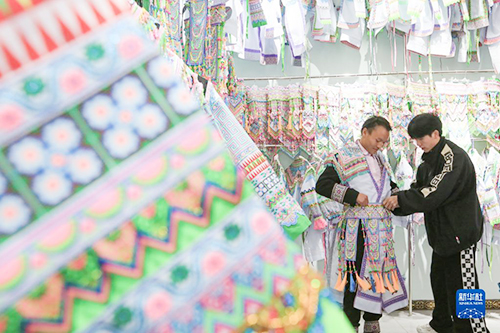 1月24日,苗族青年在尖山村一家民族服饰厂选购苗族服饰。