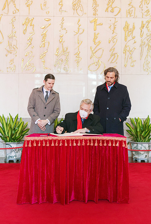在此次费尔南德斯总统访华期间,中阿双方还签署《中华人民共和国政府与阿根廷共和国政府关于共同推进丝绸之路经济带和21世纪海上丝绸之路建设的谅解备忘录》等一系列合作文件。图为2月5日,阿根廷总统费尔南德斯在人民大会堂签署文件。