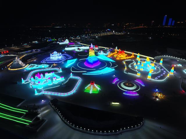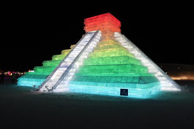 近日,在中国“冰城”黑龙江省哈尔滨市,位于松花江北岸的哈尔滨冰雪大世界园区内,墨西哥库库尔坎金字塔冰雕建筑“太阳的永恒回归”流光溢彩,吸引游客驻足观看。