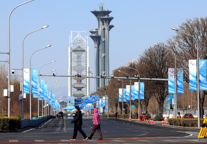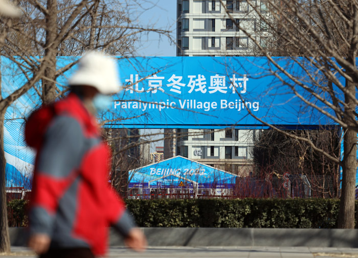 据了解,北京冬残奥会火炬传递将于3月2日至4日在北京、延庆、张家口三个赛区举行。图为3月1日,市民在北京冬残奥村出入口经过。南美侨报网特约记者卞程宣摄