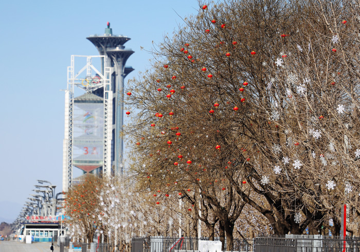 3月1日,北京冬残奥会开幕倒计时第3天,北京街头树上挂满“雪容融”。南美侨报网特约记者卞程宣摄