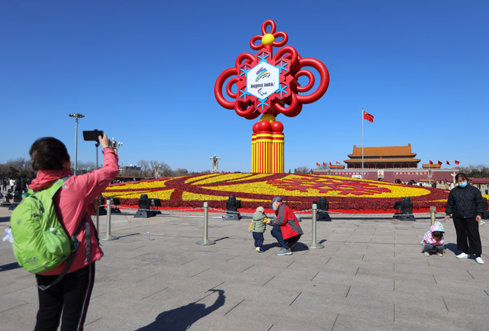 3月1日,游客在北京天安门广场欣赏“精彩冬奥”主题花坛,冬奥会标识被替换成了冬残奥会标识。南美侨报网特约记者卞程宣摄