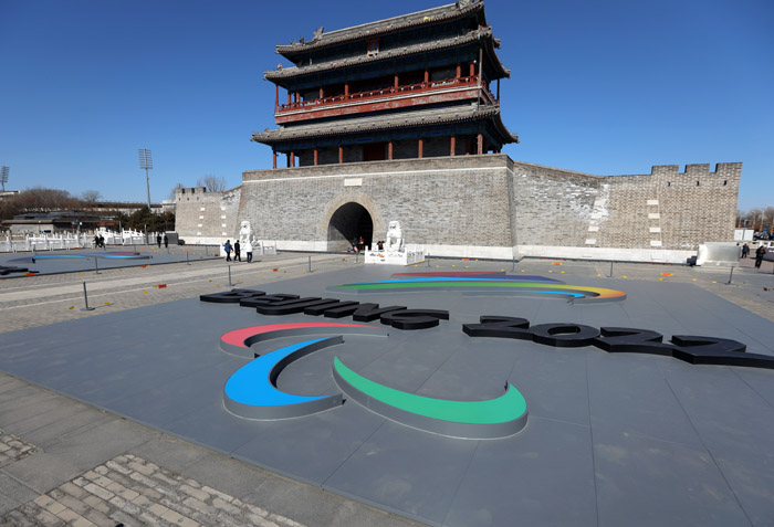 3月1日,北京2022年冬残奥会会徽亮相北京永定门广场,引游客参观。南美侨报网特约记者卞程宣摄