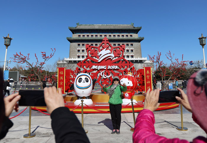 3月1日,游客在北京前门大街冬残奥会花坛前留影。南美侨报网特约记者卞程宣摄