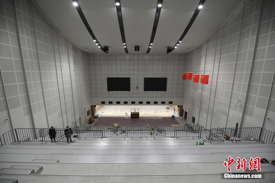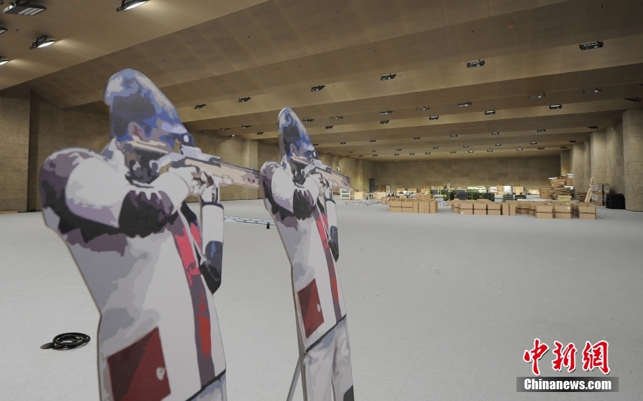 3月24日,富阳银湖体育中心的射击决赛馆正在进行赛事器材安装摆放工作。