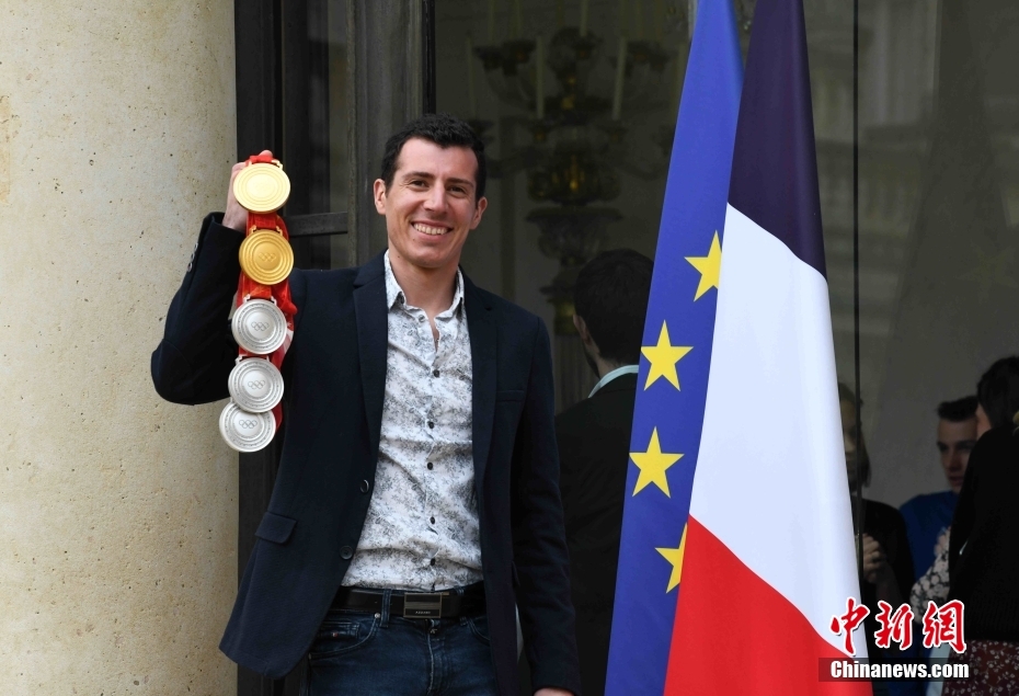 法国运动员康坦·菲永·马耶展示他在北京冬奥会上获得的2金3银共5枚奖牌。他是第一位在单届奥运会上获得5枚奖牌的法国运动员。