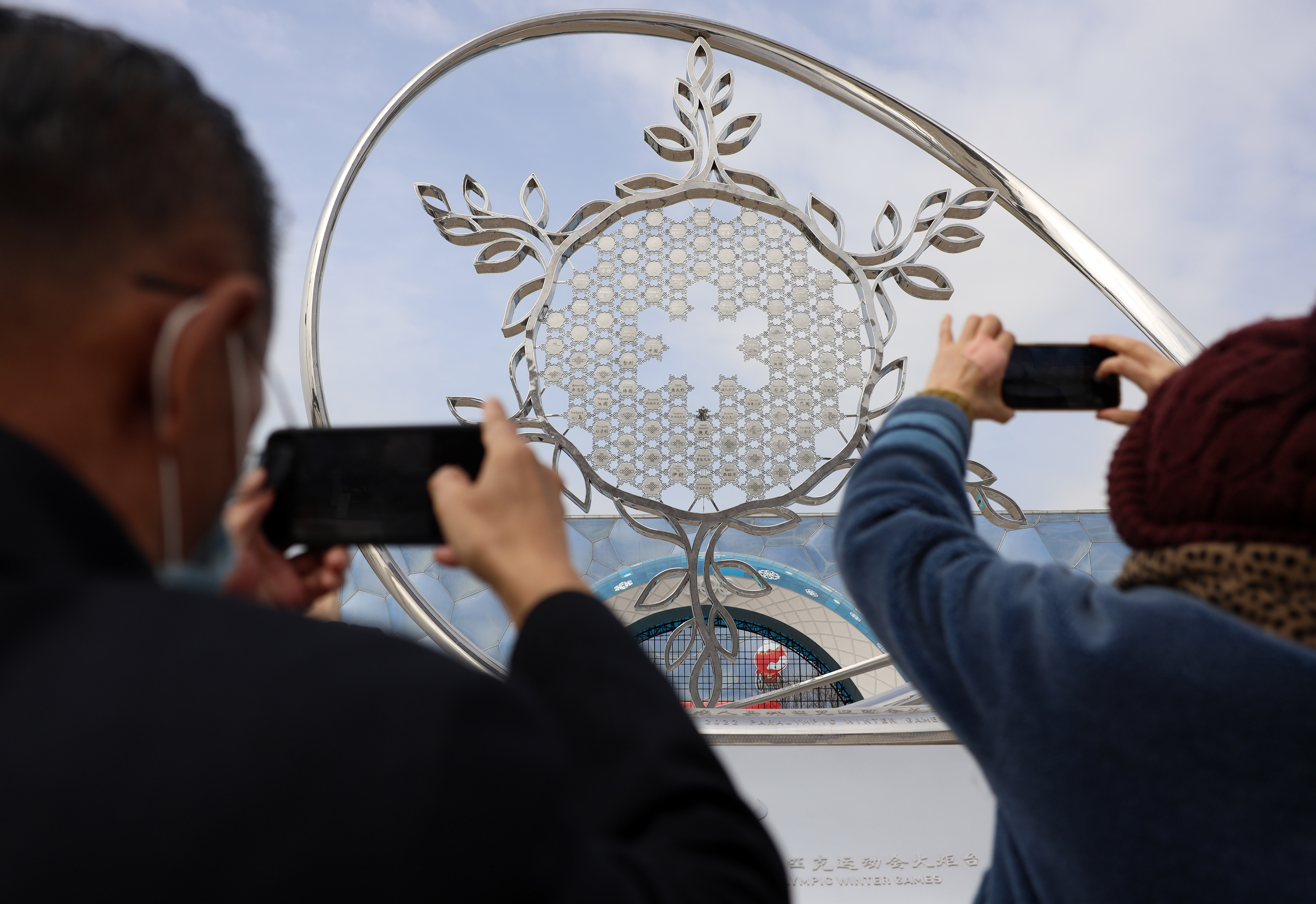 2022年4月6日,由“雪花”火炬和“飘带”组成的北京2022年冬奥会北京赛区火炬台吸引游客拍摄。 南美侨报网特约记者卞程宣摄