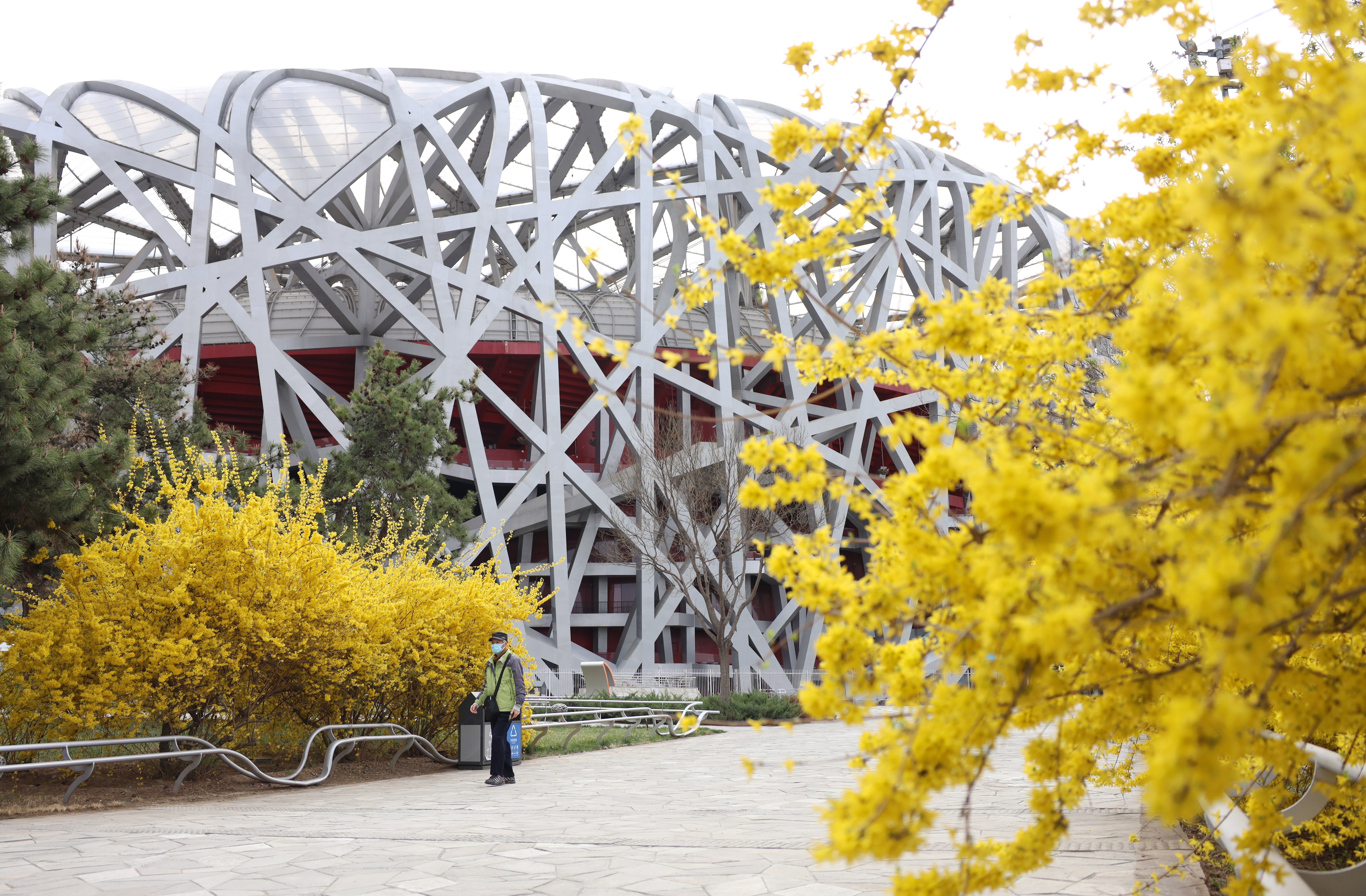 2022年4月6日,春花盛放北京奥林匹克公园中心区,游客在“鸟巢”前参观游览。 南美侨报网特约记者卞程宣摄