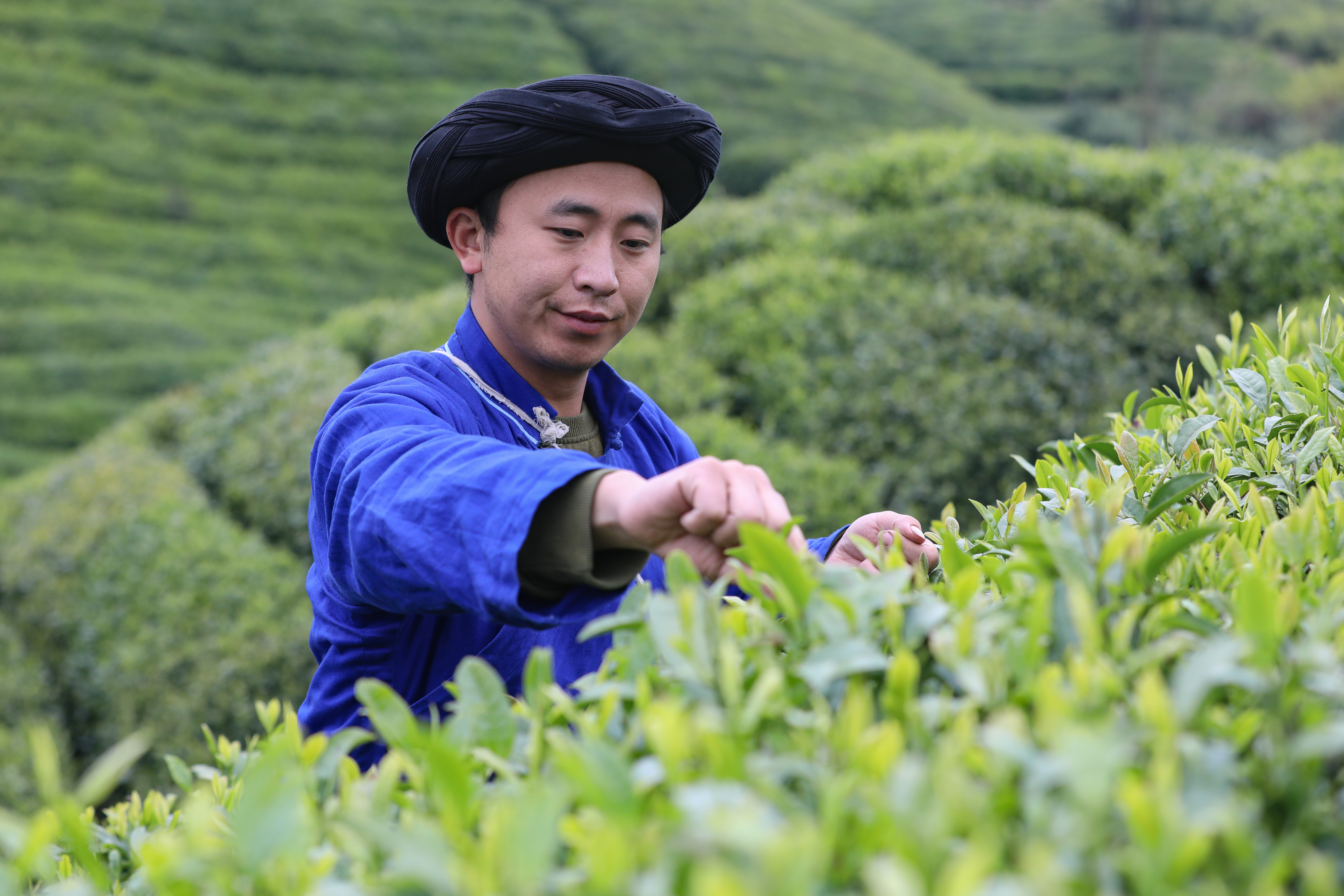 1996年出生的杨庚洪是贵州省黔南布依族苗族自治州贵定县云雾镇的“乡村制茶工匠”,同时也是黔南自治州“云雾贡茶手艺制作技艺”非遗传承人。他在传统制作手艺的基础上进行创新,制作出的茶叶深受消费者喜爱。图为4月5日,杨庚洪在云雾镇茶园采摘鲜叶。