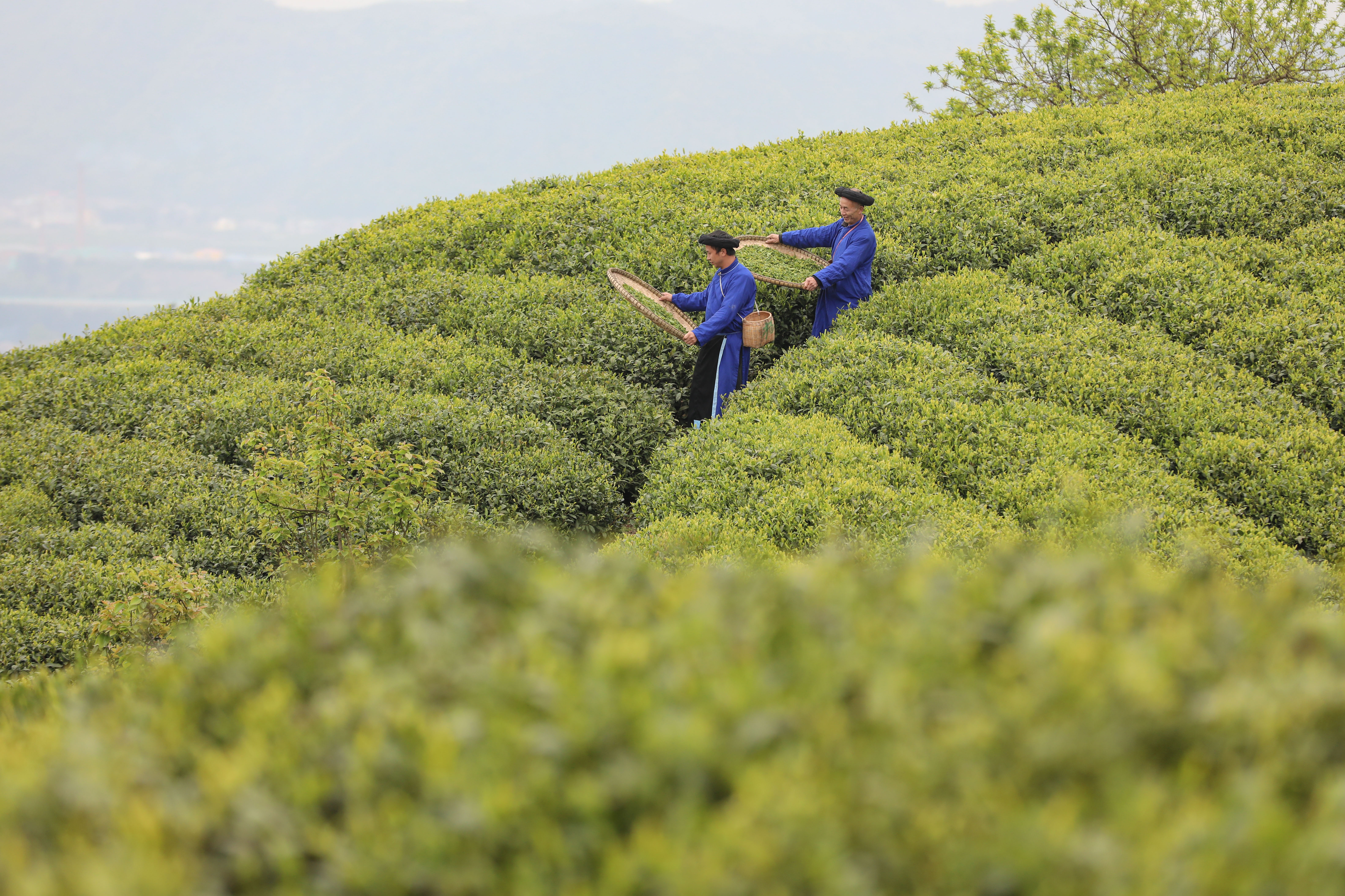 受父亲杨国能、母亲潘英慧的影响,杨庚洪从16岁开始学习“云雾贡茶”制作,至今已有10年,采茶、制茶已经成为了他生活中不可分割的一部分。图为4月5日,杨庚洪(前)和父亲杨国能采摘完鲜茶后走出茶园。