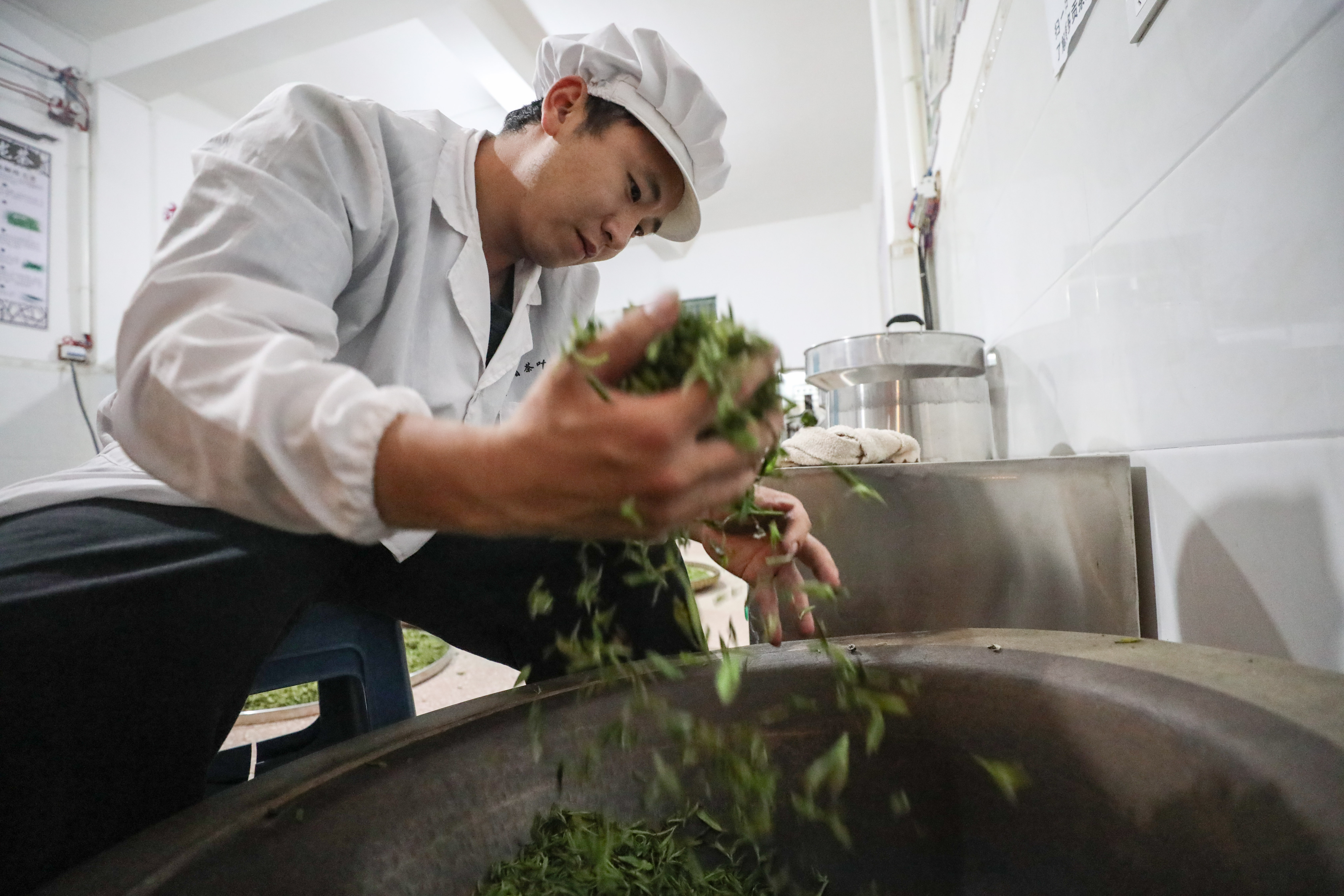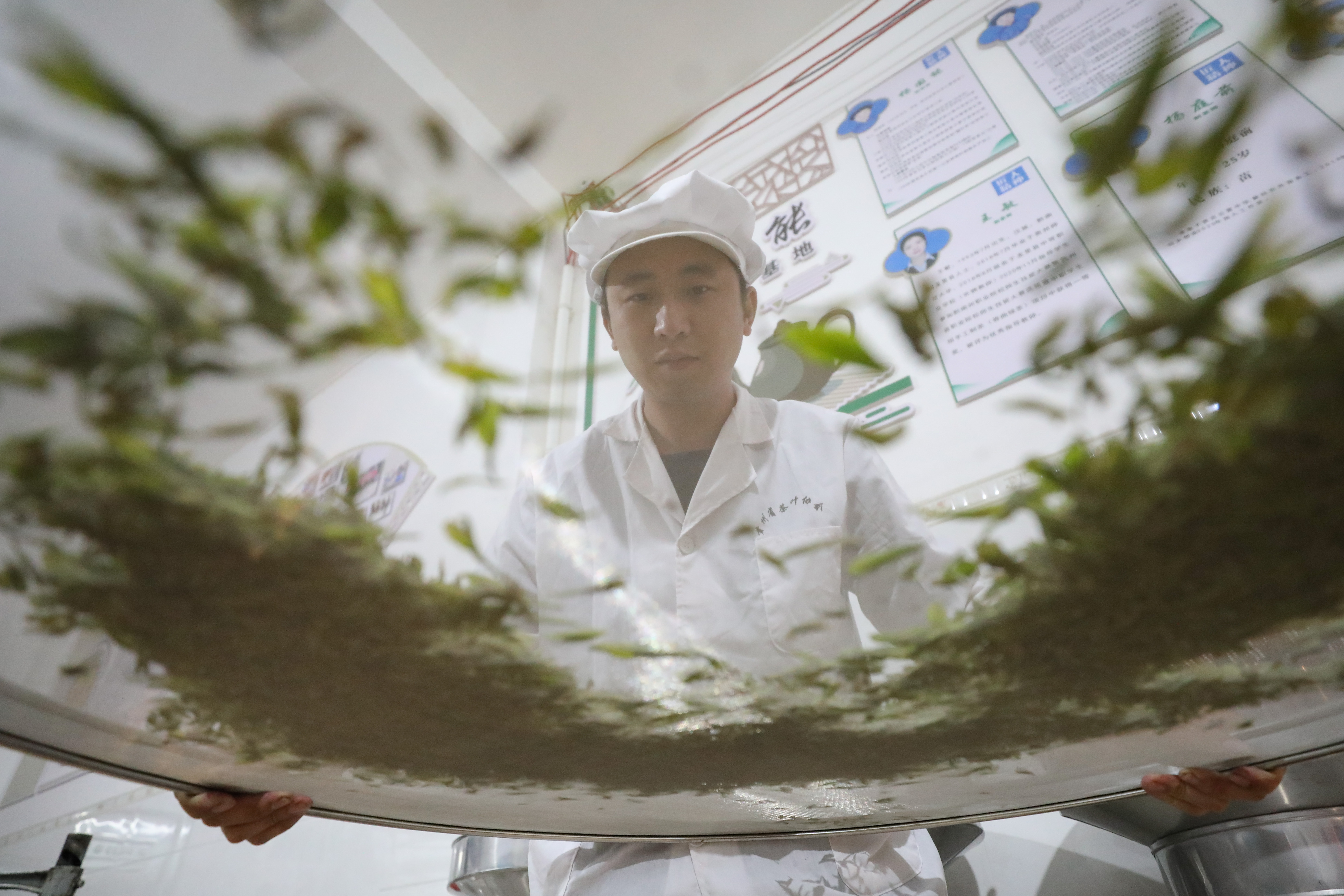 “对于年轻一代制茶师来说,我们不能停留在原地,必须在传承中进行创新。”如今,杨庚洪还在不断思考、学习,他希望通过自身努力把家乡茶叶品质做得更好,让更多人了解并喜欢“云雾贡茶”。同时,杨庚洪还在多所学校兼职教师,将所掌握的“云雾贡茶”制作技艺传授给更多爱茶的年轻人。图为4月5日,杨庚洪在茶叶加工车间冷却茶叶。
