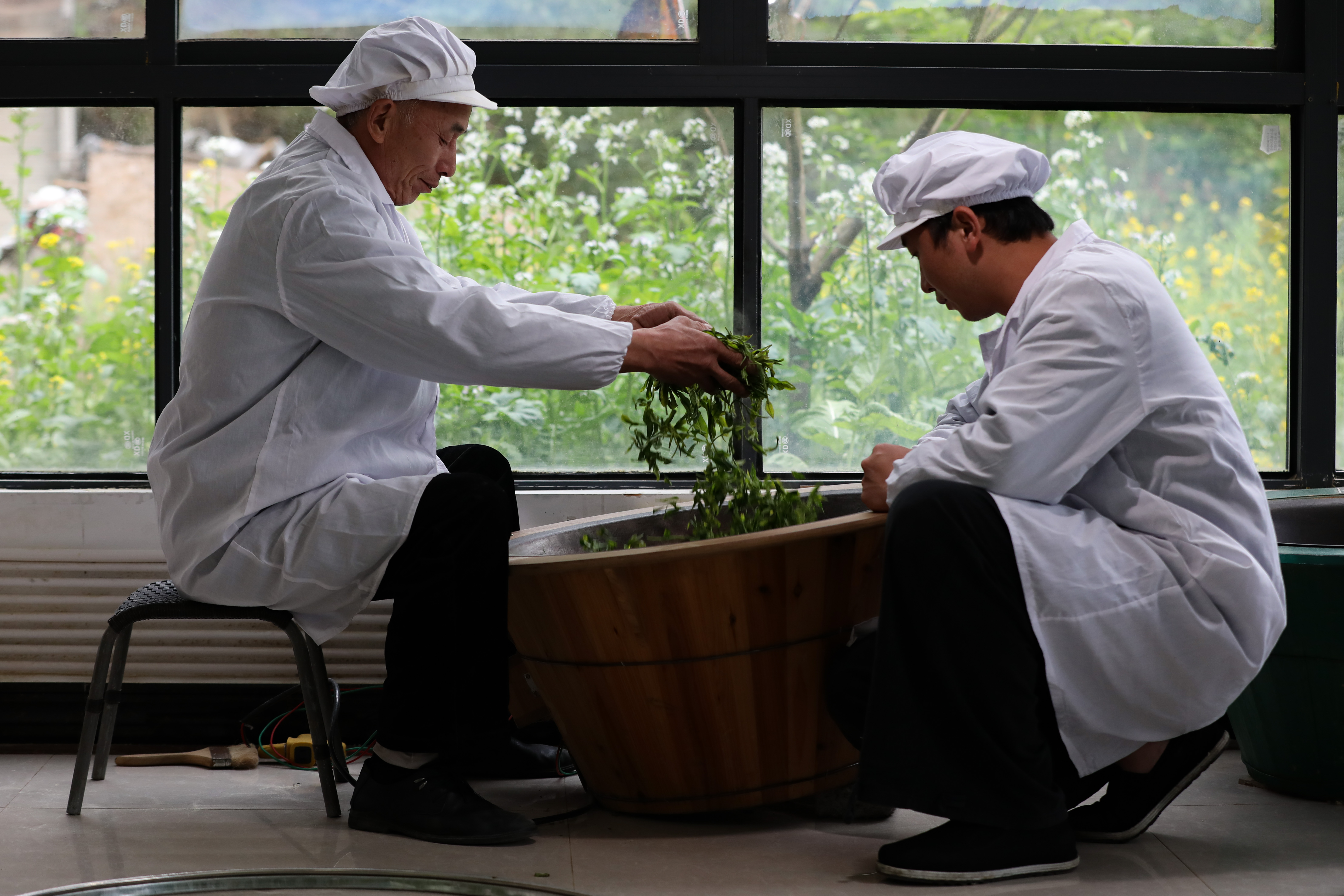 “云雾贡茶”的传统手工制作需要约一个小时,可归纳为“三炒三揉一烘干”。随着年龄的不断增长,茶学系毕业的杨庚洪基于传统的制作手艺开始创新,他改变传统的茶叶干燥工序,使用“先八成干出锅冷却,后回锅恒温干燥”方式,制作出的茶叶色泽翠绿、条索紧实,深受消费者喜爱。图为4月5日,父亲杨国能(左)在给杨庚洪演示炒茶手法。