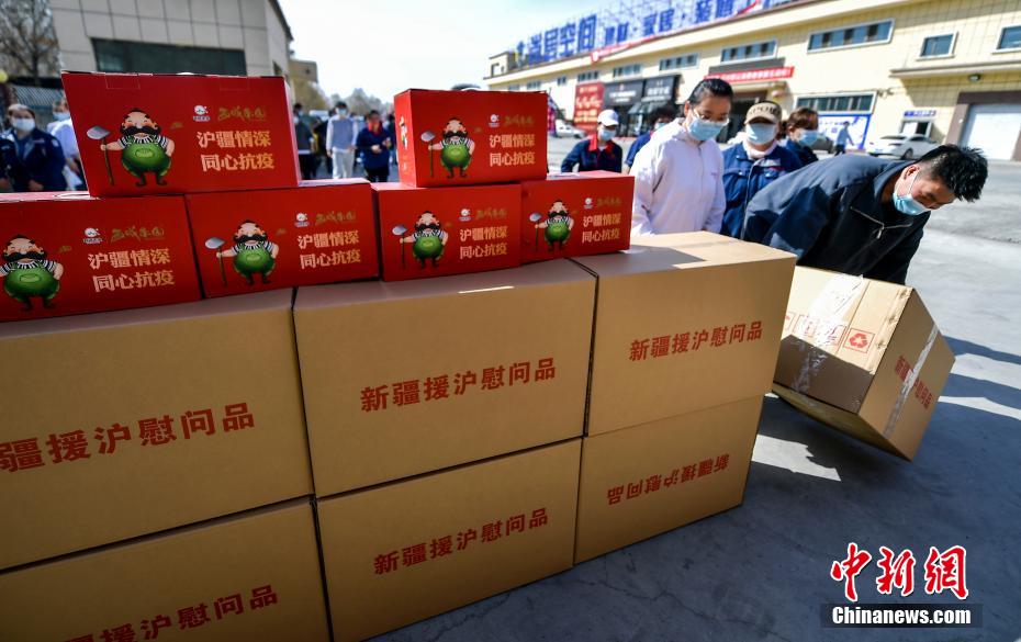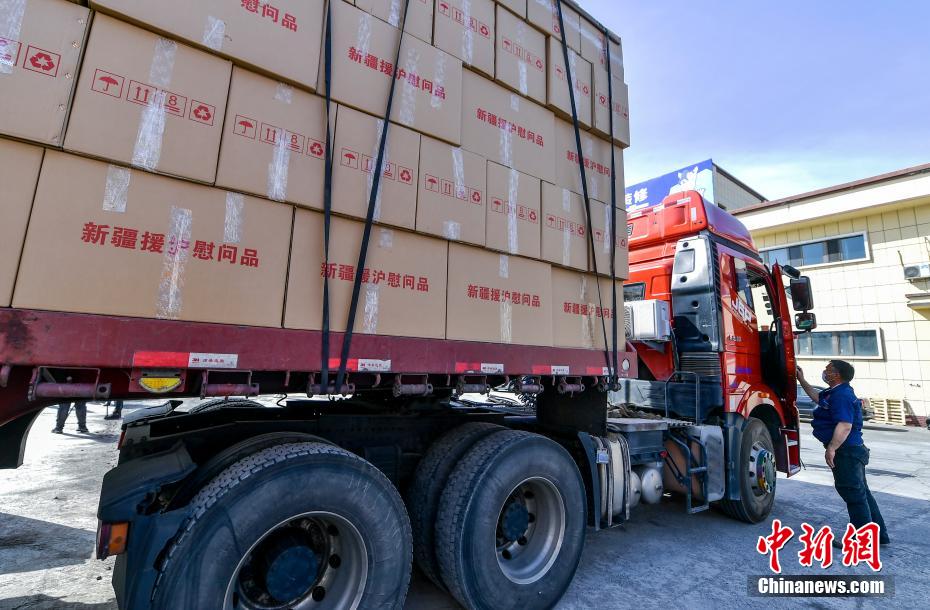 第一批援沪抗疫物资,1.6万份新疆特色干果盒装车出发,预计4天后抵达上海。中新网