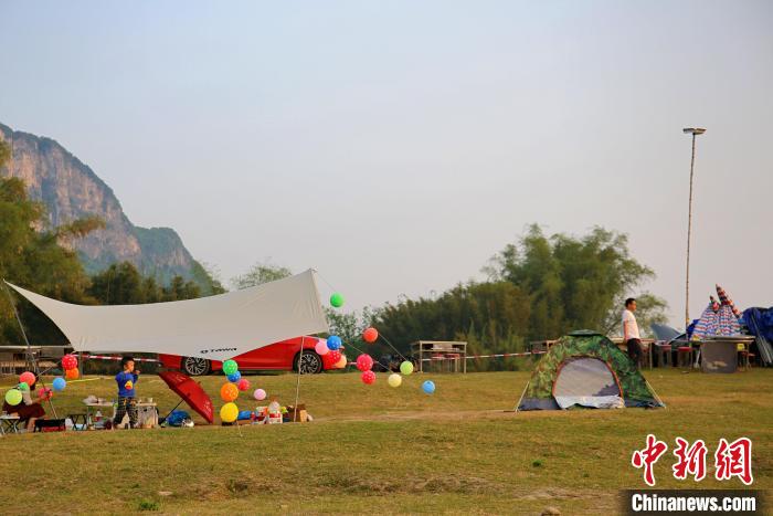 4月9日,虽然广西柳州市最高气温已经超过30℃,仍阻挡不了人们露营的热情。图为在柳州市白沙镇白沙村沿江的露营地上,出游的市民将帐篷进行个性化装扮。中新网