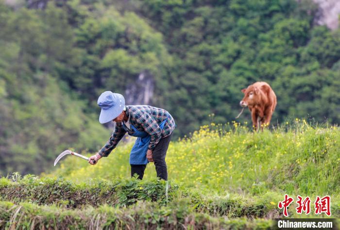 4月19日,四川省内江市高梁镇新牌坊村村民在赶牛耕田。新华网