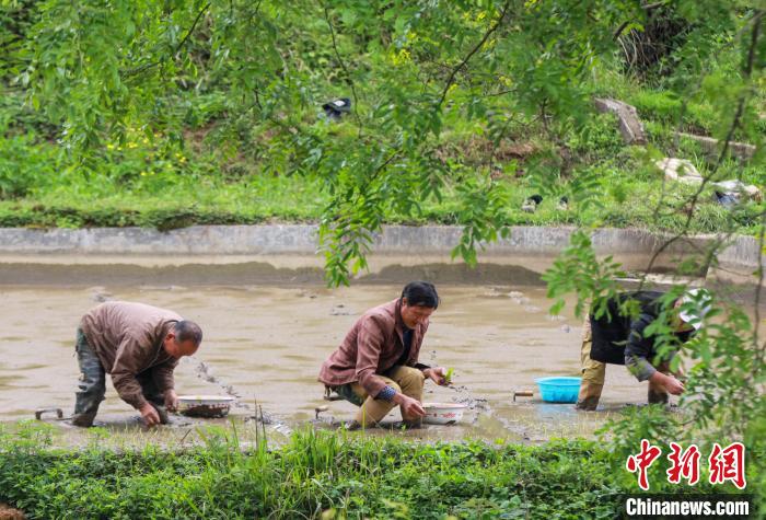 图为施秉县杨柳塘镇地坝村村民在摆放秧苗。中新网