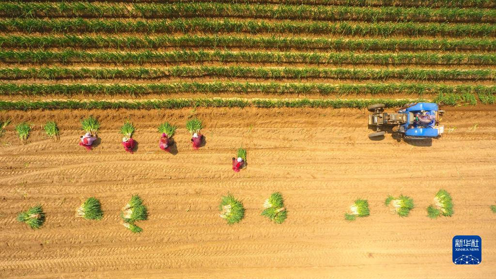 4月19日,山东省聊城市贾寨镇邢胡刘村的农民在田间收获大葱(无人机照片)。新华网
