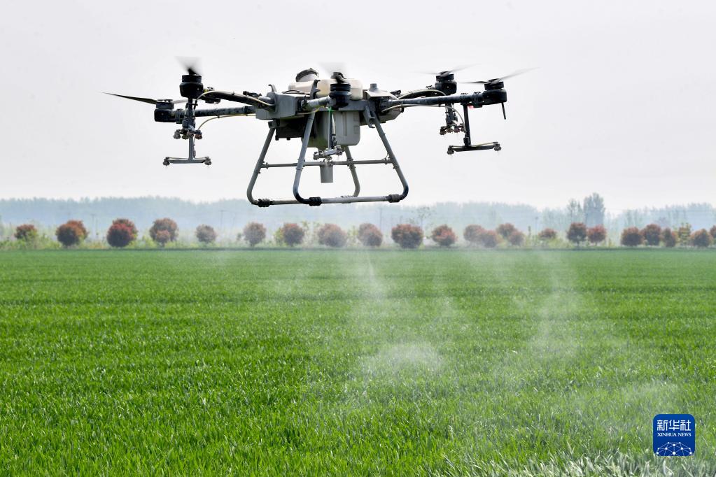 4月19日,在安徽省亳州市双沟镇三官村,植保无人机在对小麦进行“一喷三防”作业。新华网