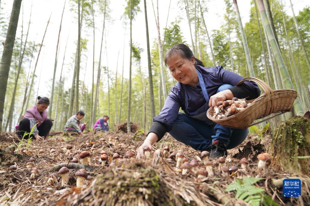 4月19日,农民在贵州省赤水市宝源乡回龙村竹林间采收赤松茸。新华网