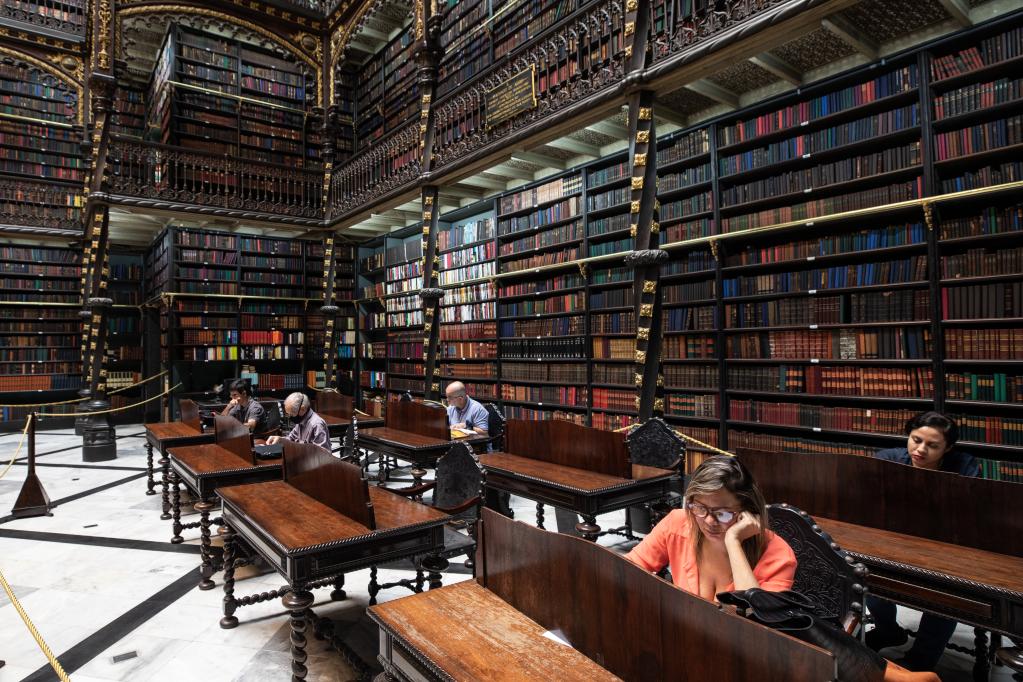 4月19日在巴西里约热内卢拍摄的皇家葡文图书馆书架。