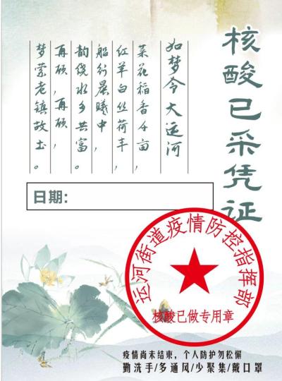 近日,杭州各社区的“花式”核酸采样凭证火了。有的古色古香,有的可爱卡通,有的每天卡面各不同,居民只有完成核酸检测才能拿到。方寸之间尽显用心,成为同心抗疫过程中的一抹别样亮色。图为杭州市临平区运河街道核酸凭证。运河街道供图