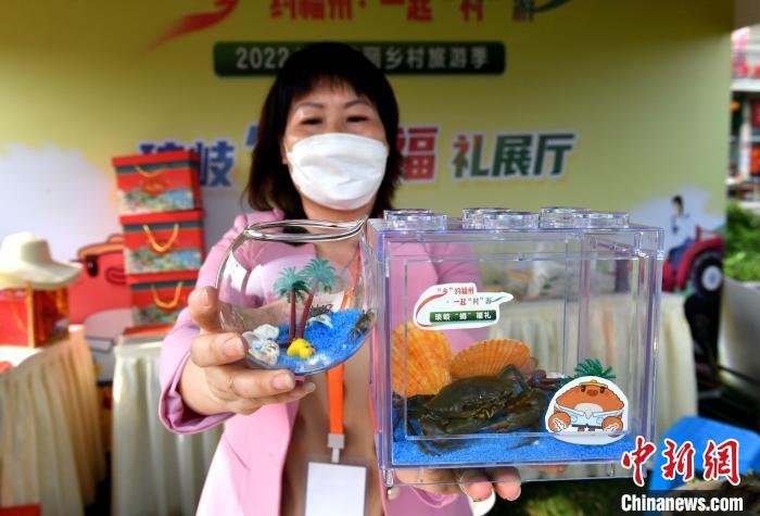 琅岐红蟳由于个头大、品质优、无污染而远近驰名,2015年被列为国家地理标志产品。图为商家展示红蟳文创产品。中新网