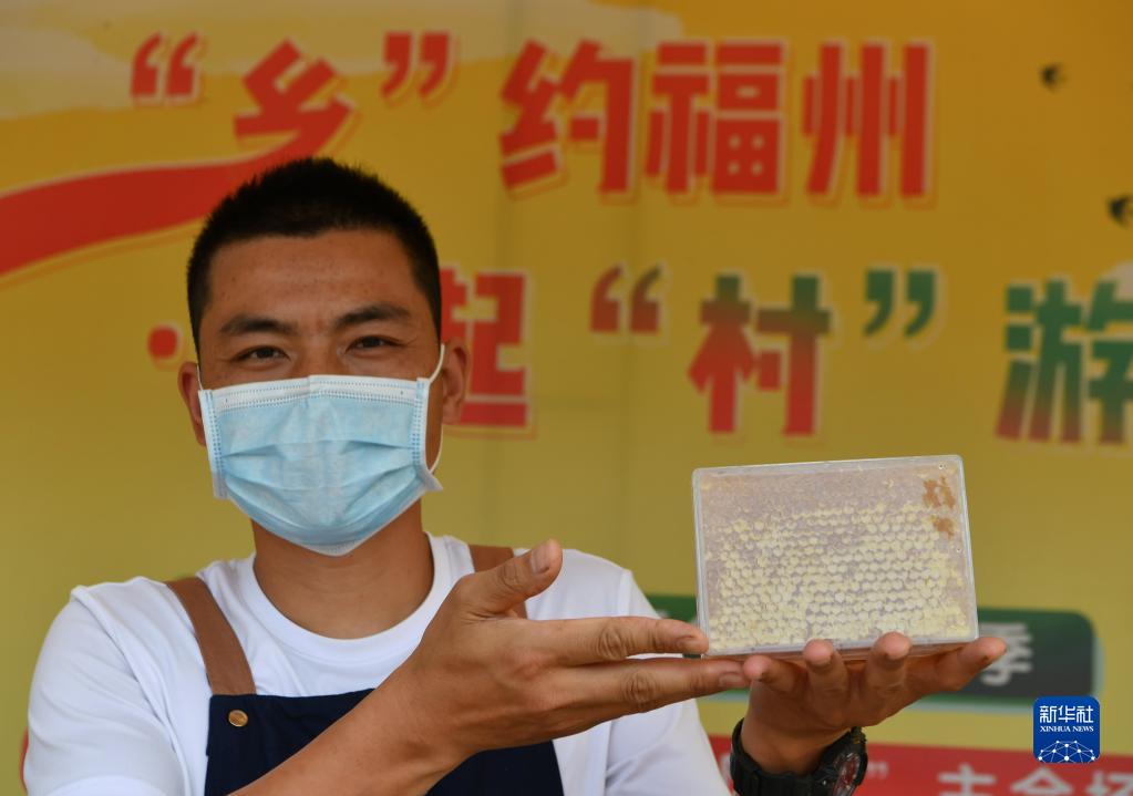 4月28日,在2022福州美丽乡村旅游季启动仪式现场,永泰县返乡创业致富带头人杨经提展示他的特色农产品巢蜜。新华网