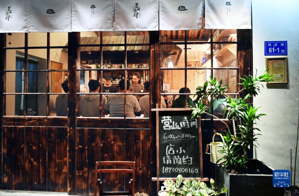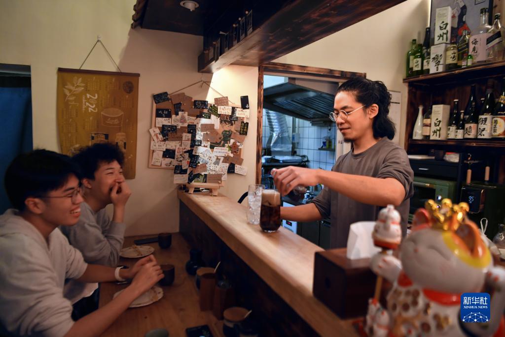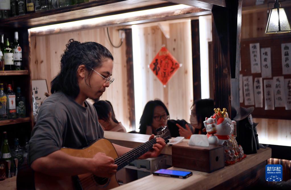 2016年,王圣棻跟随父亲到大陆寻找商机。不久,他在厦门集美区跟朋友们合开了一间轻食餐厅。2022年,在厦门集美区有关部门的帮助下,他投资12万元自己创业,开了一家深夜食堂“更也酒肆”,很快成为厦门的“网红美食打卡店”。“做餐饮是一件很快乐的事情,能融入到厦门当地的生活圈子。未来,我想在厦门安家扎根,下一家店正在筹备中。”王圣棻说。图为王圣棻在“更也酒肆”里自弹自唱,新颖的经营方式吸引店铺周边的年轻人前来消费(5月1日摄)。