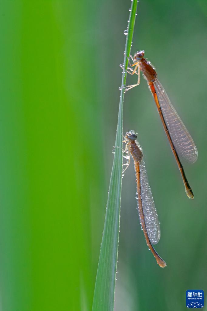 4月29日,两只豆娘在山东省淄博市高青县常家镇一处池塘的芦苇叶片上栖息。新华网